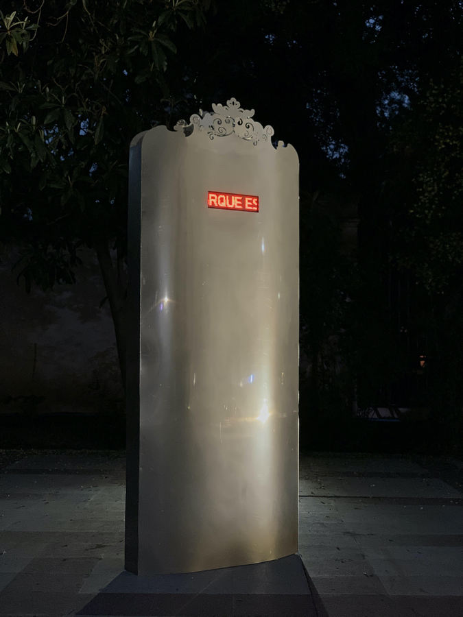 | DESCRIPCIÓN VISUAL | Escultura de latón rectangular en formato vertical, con una decoración estilo art-deco en la parte superior, incorpora una pantalla LED con frases de protesta vistas en los rayados de los muros de Santiago tales como: “Hasta que valga la pena vivir” y “Chile despertó”. |